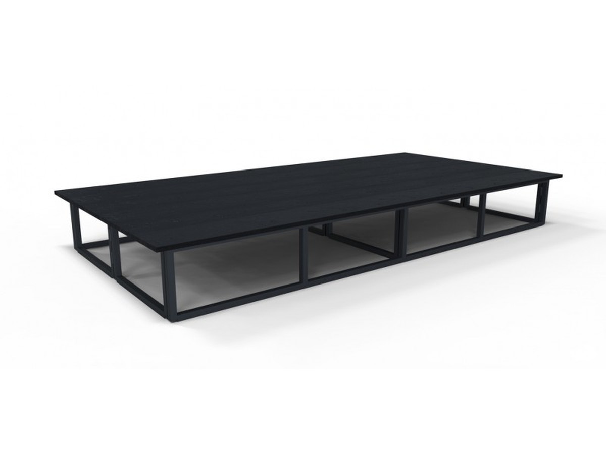 The frames are made from steel which is powder-coated black. Their design allows them to fold down to only 5” deep for easy storage and transportation. The stage top is made from 18mm Birch ply which is stained black using a durable paint.