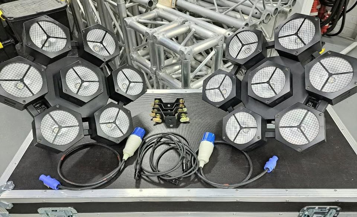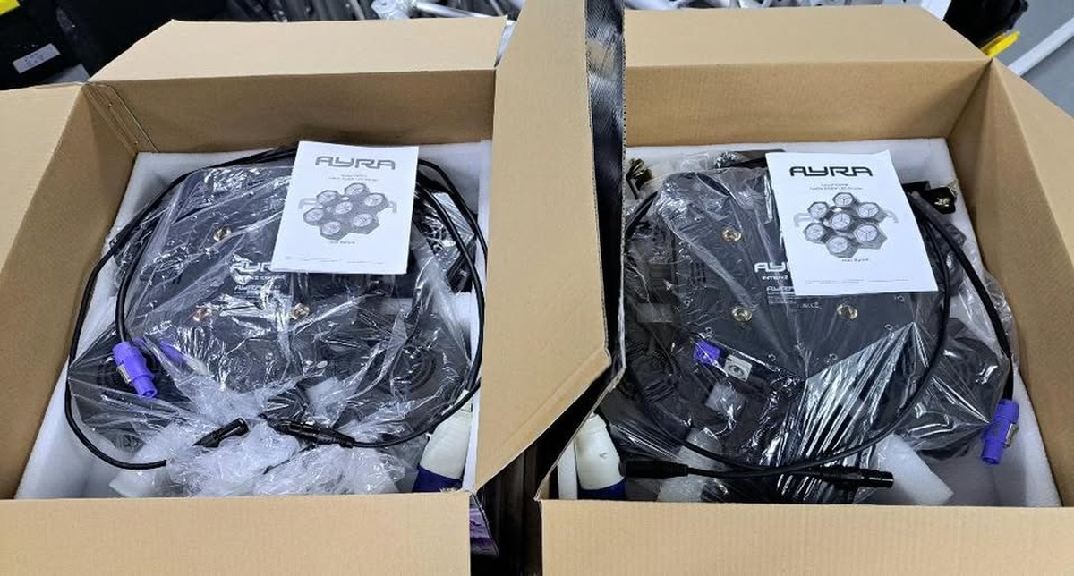 Boxed with instructions, clamps, dmx cable, and Powercon to 16a Ceeform cable.